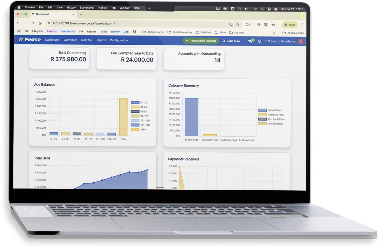 As your dedicated debt management partner, Fease, which is seamlessly integrated with d6+, offers an effective solution to simplify fee recovery. We help you transition from stressful administration to sustainable financial well-being while preserving the trust you’ve built with your families. Our schools have reported that our solution significantly reduces the time spent on debt management, unlike other systems that are not integrated and require manual processes.